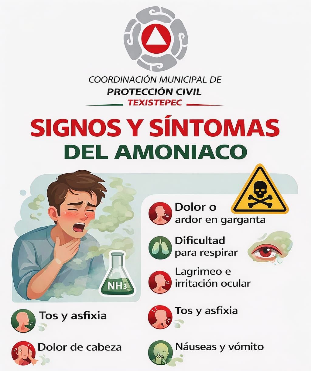 En este mismo aviso, la coordinación municipal de Protección Civil Texistepec, ha presentado a la ciudadanía los signos y síntomas comunes por intoxicación de amoniaco, entre los que se encuentran tos y asfixia, dolor de cabeza, dolor o ardor en la garganta, dificultad para respirar, lagrimeo o irritación ocular, náuseas y vómito.