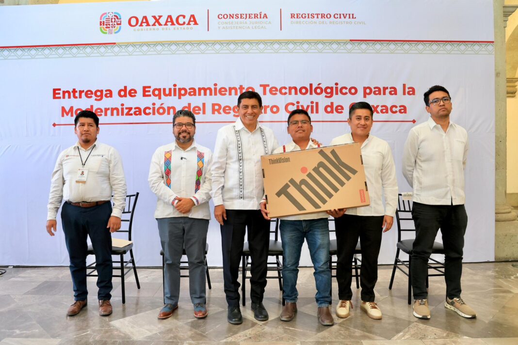 El Gobernador Salomón Jara Cruz, acompañado del director del Registro Civil, Alfredo Santiago Chávez, encabezaron la entrega de equipos tecnológicos para la modernización de las oficialías de esta dependencia, dotando de computadoras, impresoras, insumos e instalación de internet satelital, con el objetivo de fortalecer la atención ciudadana.