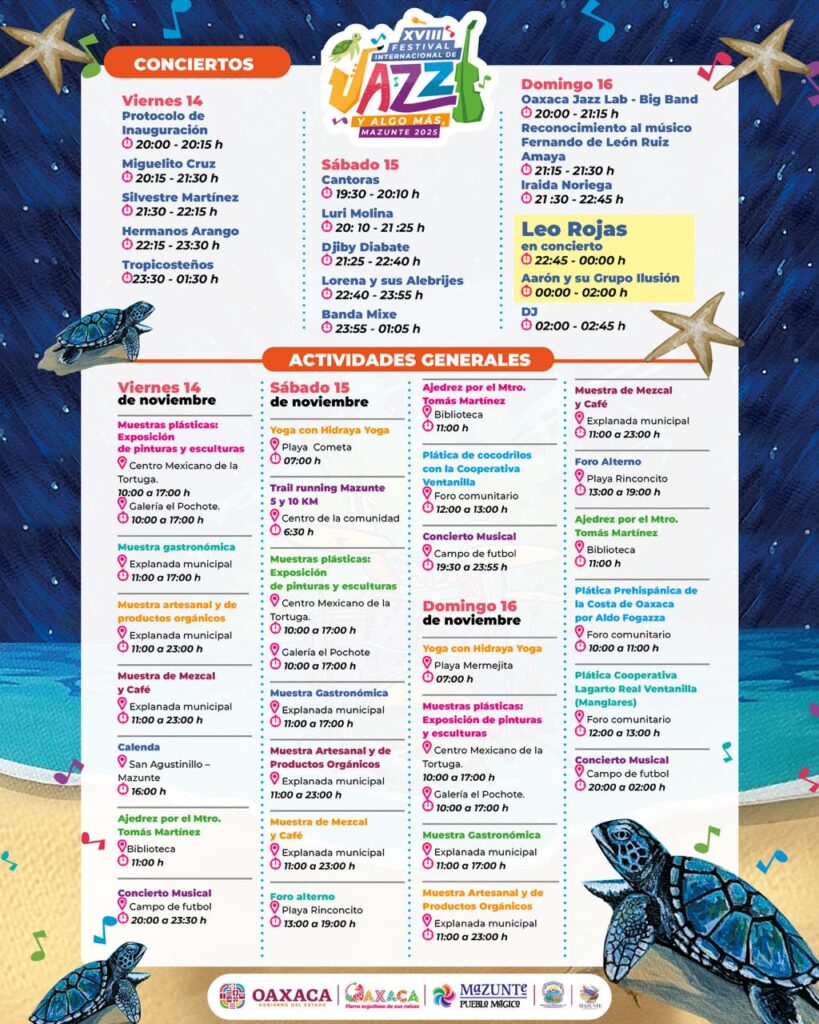 El Festival Internacional de Jazz y Algo Más albergará muestras gastronómicas, exposición de artes plásticas, artesanales y de productos orgánicos; charlas, yoga y el Trail Running Mazunte. Quienes deseen más información pueden consultar la cartelera completa en el siguiente enlace: https://oaxaca.travel/.